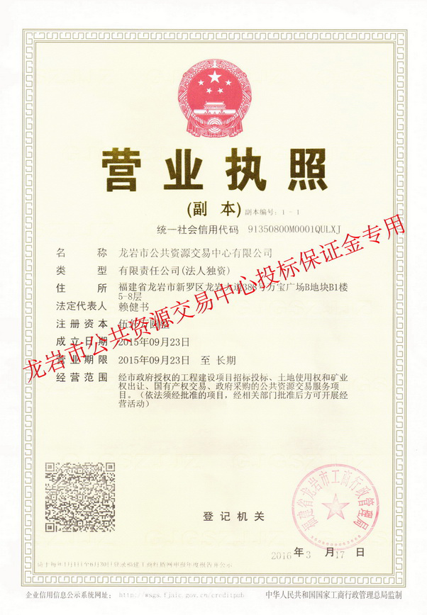 龙岩市公共资源交易中心有限公司和各分公司营业执照(投标保证金专用)